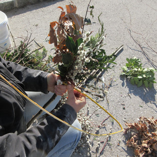 Dann kommen je ein Zweig vom Schradl, Kranawitten, Segenbaum, Buxbaum, Wintergrün, Seidelbast und Eichenlaub dazu. Alles wird auf die selbe Länge gekürzt und unten zugespitzt.